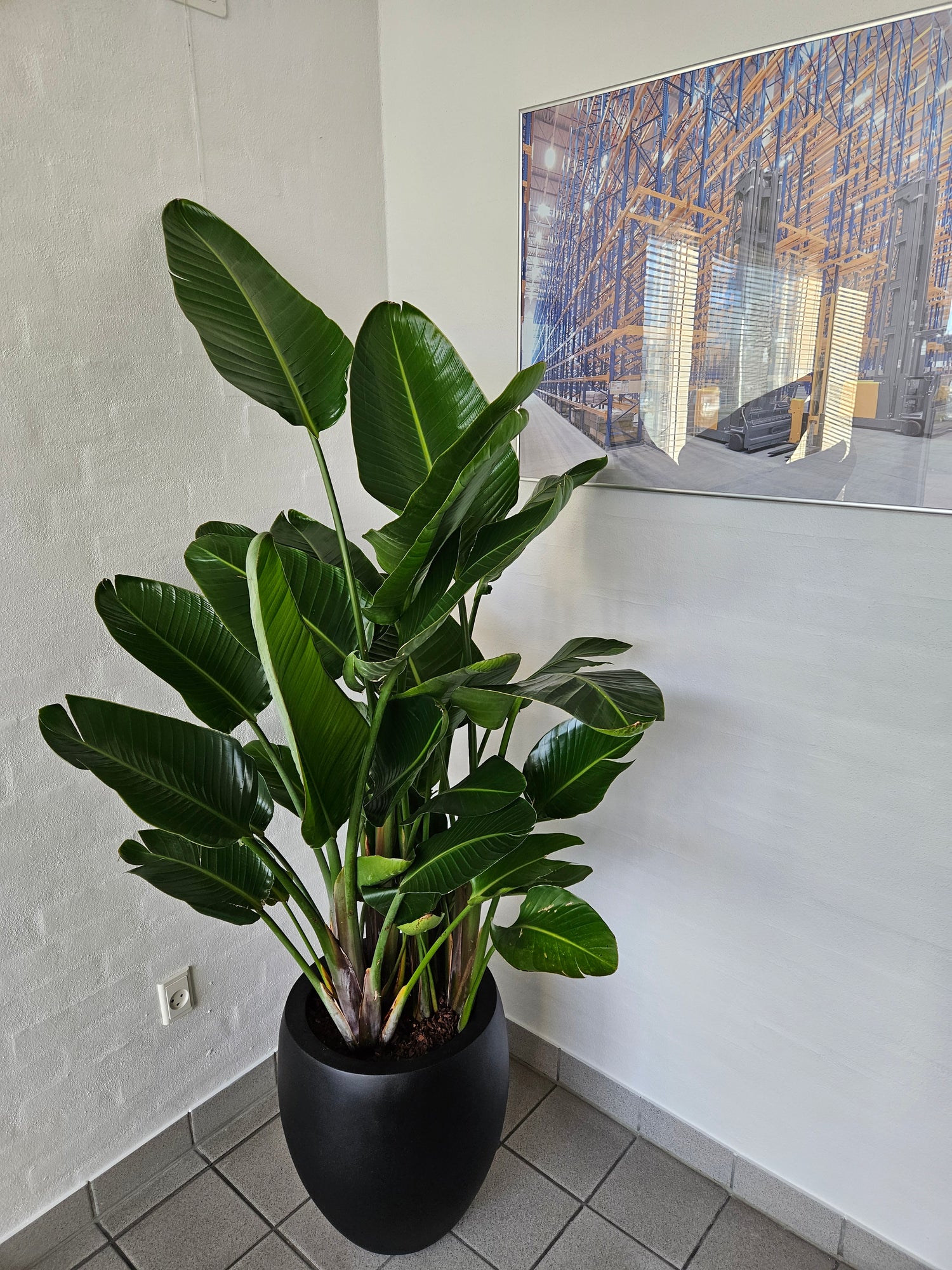 Strelizia tilplantet i en af vores populære letvægtskrukker, som kan stå både ude og inde.